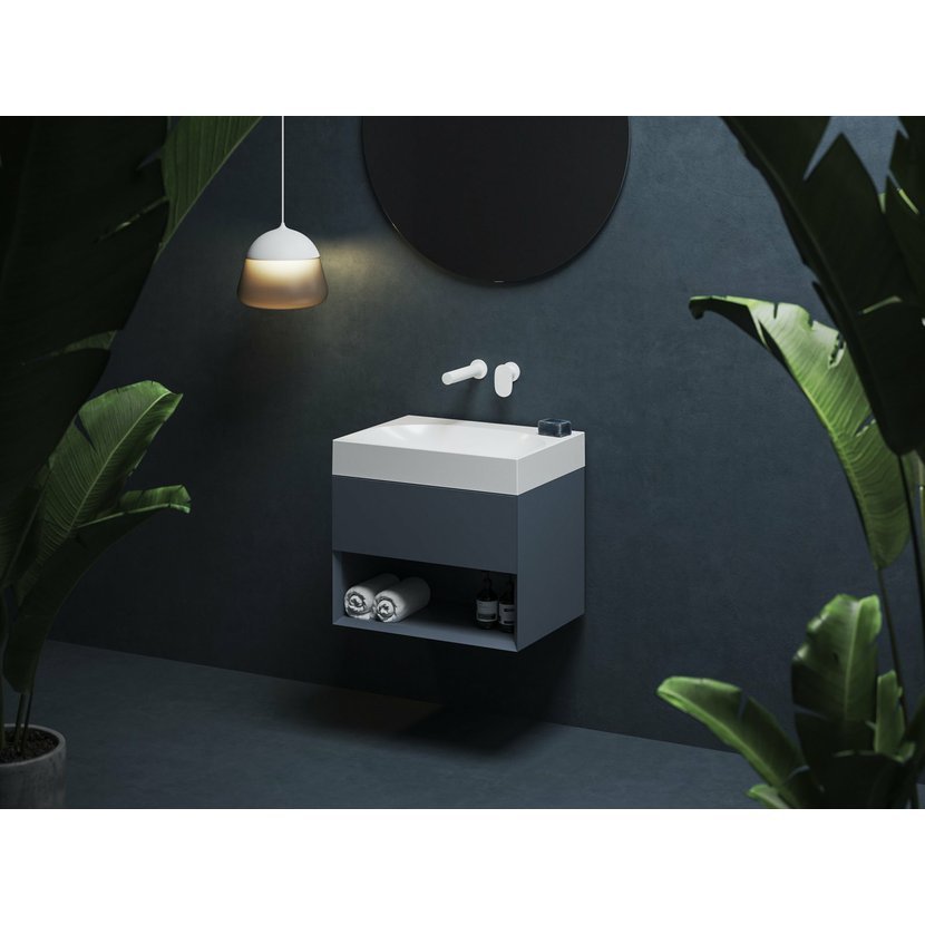 Nábytkové umyvadlo z litého mramoru Lite k instalaci na zeď nebo k zapuštění do závěsné skříňky, bez přepadu. Bílé provedení. Bez otvoru - pro kombinaci s umyvadlovou podomítkovou baterií.