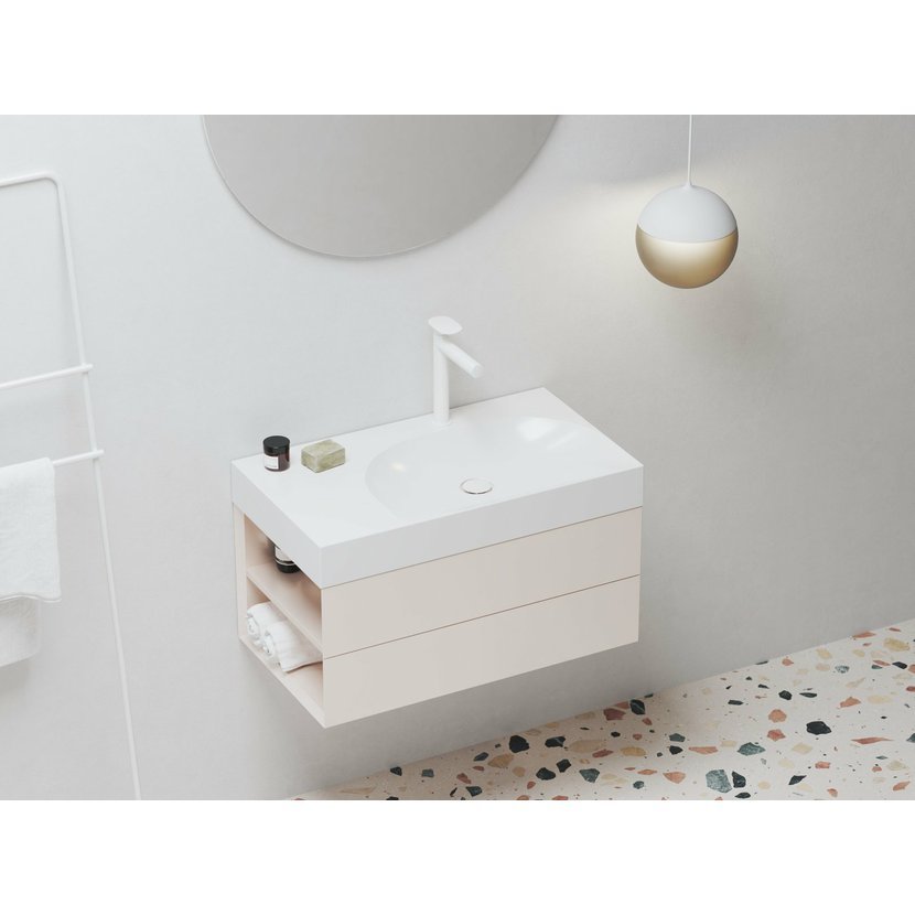 Nábytkové umyvadlo z litého mramoru Lite k instalaci na zeď nebo k zapuštění do závěsné skříňky, bez přepadu. Bílé provedení. Levá varianta. S otvorem pro umyvadlovou baterii.