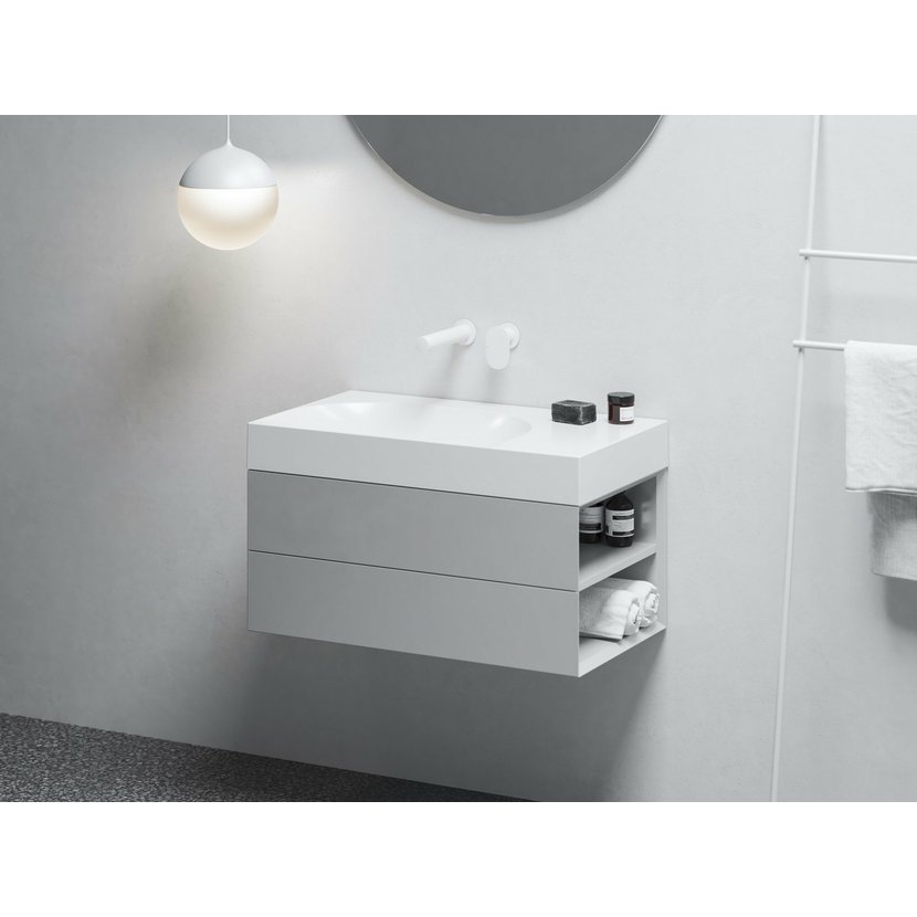 Nábytkové umyvadlo z litého mramoru Lite k instalaci na zeď nebo k zapuštění do závěsné skříňky, bez přepadu. Bílé provedení. Pravá varianta. Bez otvoru - pro kombinaci s umyvadlovou podomítkovou baterií.