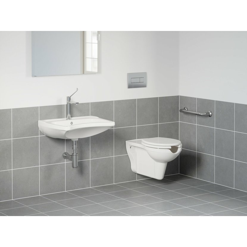 Umyvadlo Safe pro handicapované je speciálně navržené umyvadlo, které poskytuje větší komfort a přístupnost pro osoby s tělesným postižením, seniory nebo osoby s omezenou pohyblivostí. Vykrojení umyvadla v přední části umožňuje osobám na invalidních vozících nebo s chodítky pohodlný přístup k umyvadlu a umožňuje jim snadněji dosáhnout na baterii nebo do umyvadla bez nutnosti se ohýbat. Doporučujeme kombinovat s umyvadlovou baterií Safe a WC Safe RimOff setem. Umyvadlo je dodáváno s přepadem. Instaluje se na zeď. Montážní sada (připojovací hmoždinky, vruty, atd.) včetně krytky přepadu je součástí dodávky.