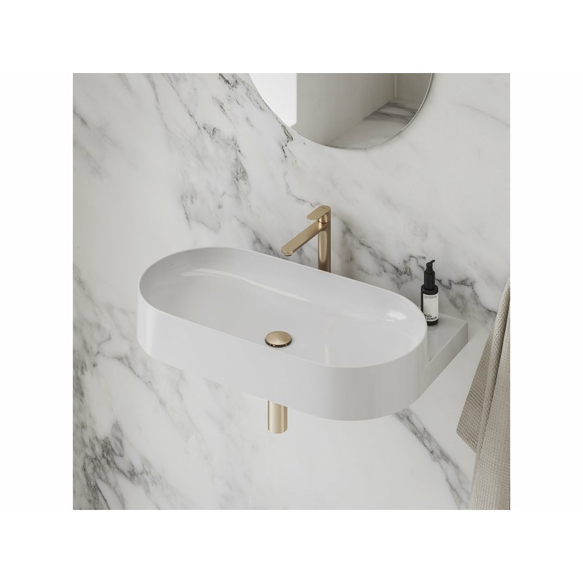 Pevná pileta v růžově zlaté kartáčované barvě působí v umyvadle luxusně. Piletu umístěnou v nástěnném umyvadle nebo v umyvadle na desku doporučujeme kombinovat se sifonem ve stejném barevném provedení.