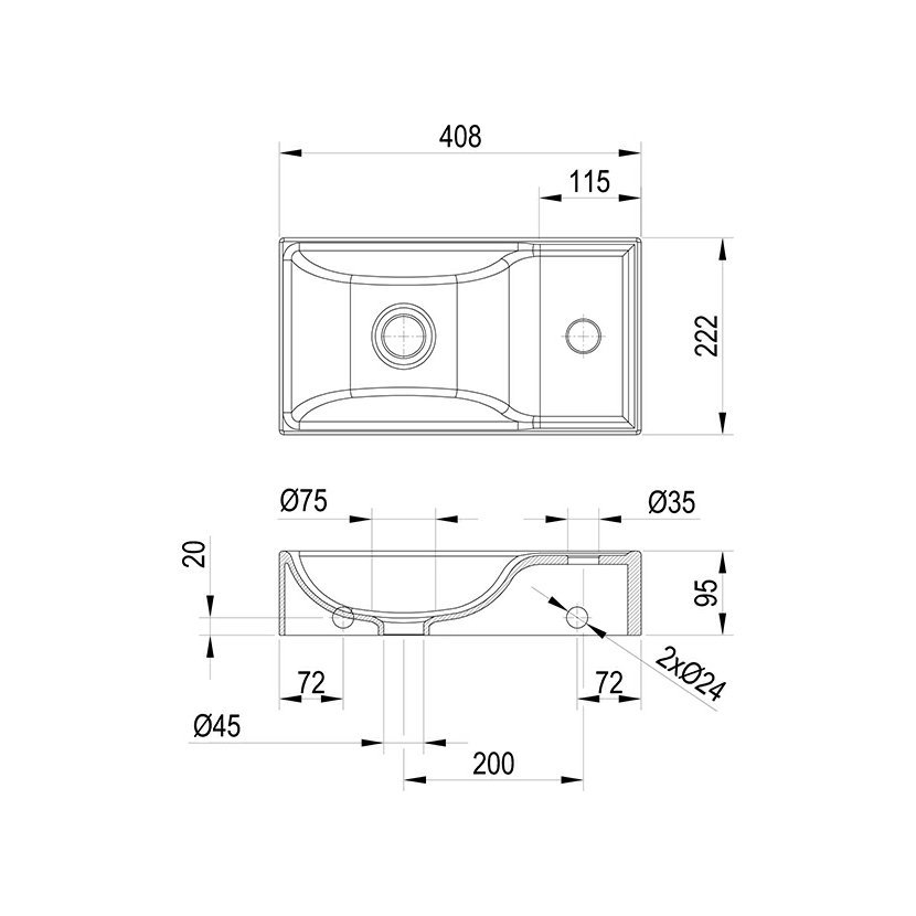 Keramické umývátko Veda Wall k instalaci na zeď, bez přepadu. Černé matné provedení. Levá varianta.