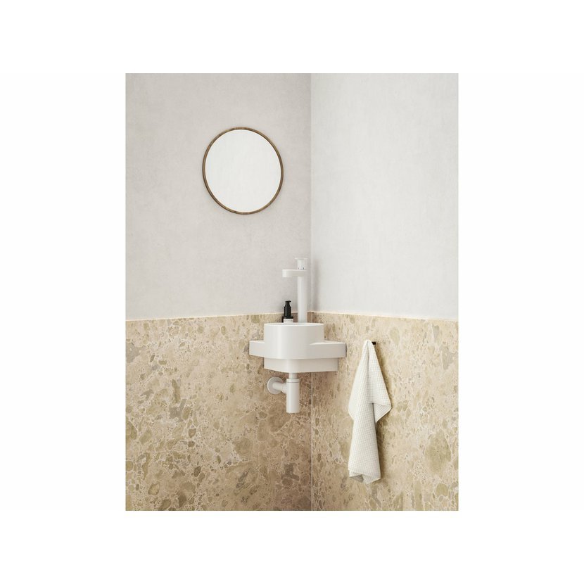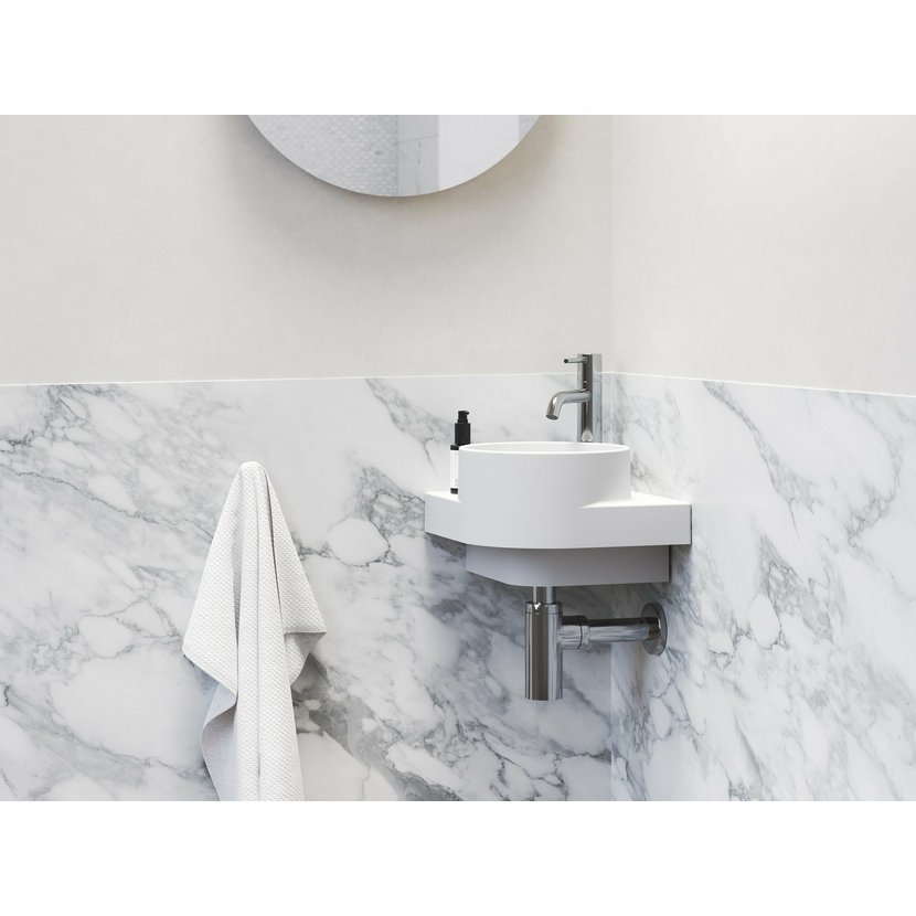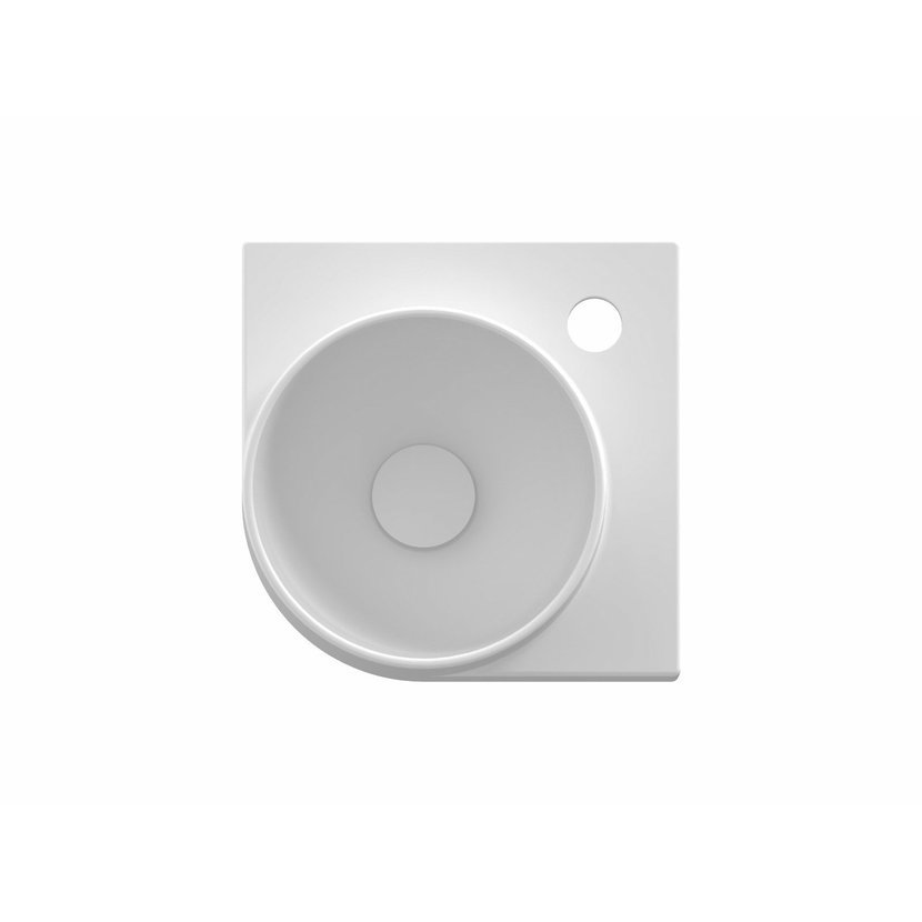 Tenkostěnné keramické rohové umývátko Yard k instalaci na konzoli Yard, bez přepadu. Bílé matné provedení. S otvorem pro stojánkovou baterii.