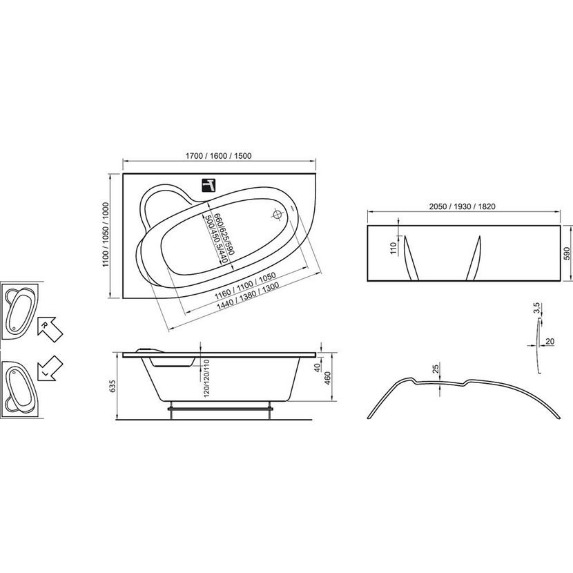 K vaně Asymmetric je možné zakoupit vanový odtokový komplet a čelní panel. Nelze ji doplnit o podhlavník nebo vanovou zástěnu. Vana je vyztužena sklolaminátem (LA).
