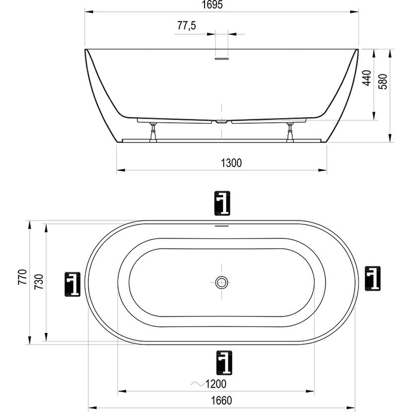 Vanu nelze doplnit vanovou zástěnou. Vanový odtokový komplet (tj. přepad, pileta, sifon, zápachová uzávěra) a podpora (nožičky) jsou součástí balení. K vaně nabízíme i volně stojící baterii zabudovatelnou do podlahy. Veškerý rozvod musí být veden podlahou (jak odpadový, tak přívody vody pro podlahovou baterii).