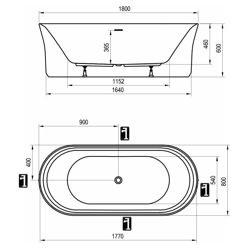 Vanu nelze doplnit vanovou zástěnou. Vanový odtokový komplet (tj. přepad, pileta, sifon, zápachová uzávěra) a podpora (nožičky) jsou součástí balení. K vaně nabízíme i volně stojící baterii zabudovatelnou do podlahy. Veškerý rozvod musí být veden podlahou (jak odpadový, tak přívody vody pro podlahovou baterii).