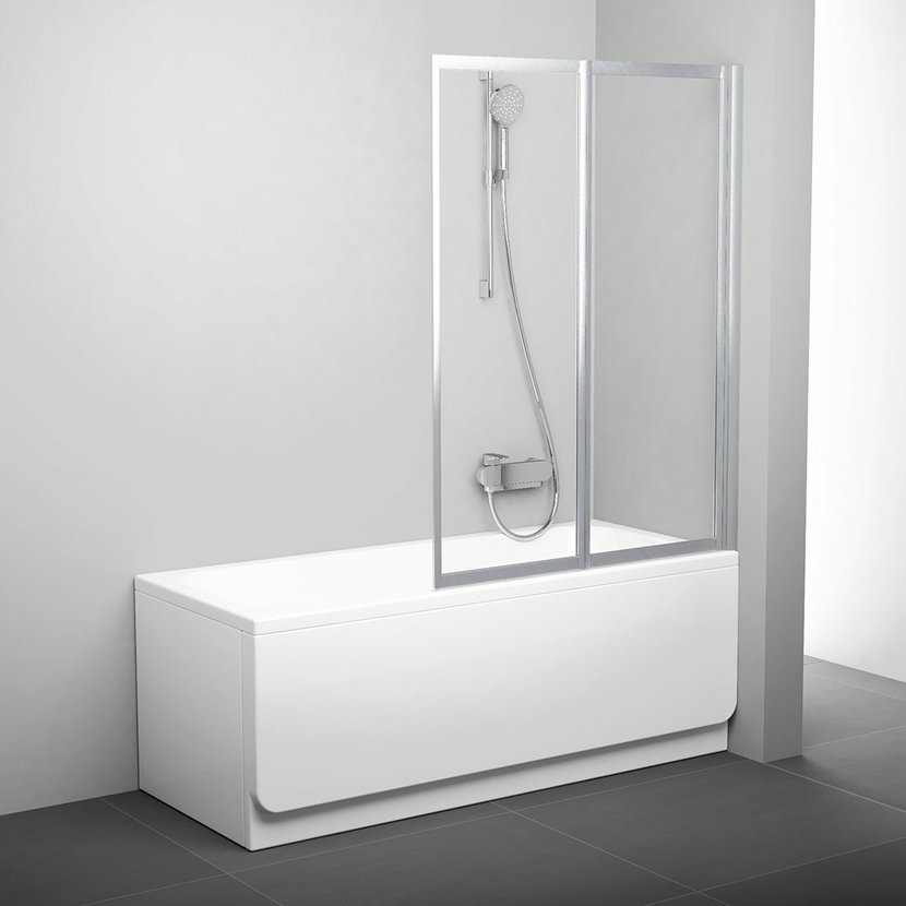 Dvoudílná skládací vanová zástěna na obdélníkové vany. V provedení matný chrom a s výplní z čirého skla s ochrannou vrstvou RAVAK AntiCalc®. Otočitelný výrobek pro levou i pravou variantu.