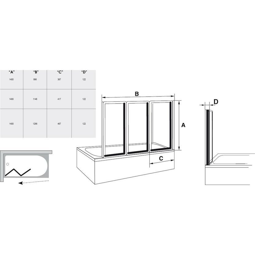 Vanová zástěna VS3 100 je vhodná k vaně BeHappy II o rozměru 150, 160 cm, VS3 115 k vaně BeHappy II 170 cm. Vanová zástěna VS3 100 má ve složeném stavu šířku 340 mm, k VS3 115 má šířku 392 a VS3 130 má šířku 444 mm. Otočením výrobku o 180° získáme variantu vstupu zprava či zleva.