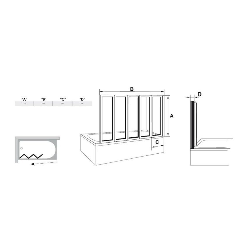 Zástěna se skládá z pěti pohyblivých dílů, které lze zcela složit (tzv. „harmonika“) do vnitřního prostoru nad vanu. Díky úzkým výplním zůstane po složení zástěny na okraji vany nejvíce místa. Vanovou zástěnu lze instalovat k obdélníkovým vanám (Classic, Classic II, Vanda II) nebo na jakoukoli klasickou obdélníkovou vanu s rovným horním lemem. Standardní výška zástěny je 1330 mm. Vanová zástěna VS5 má ve složeném stavu šířku 223 mm. Otočením vanové zástěny VS5 o 180° získáme variantu vstupu zprava či zleva.