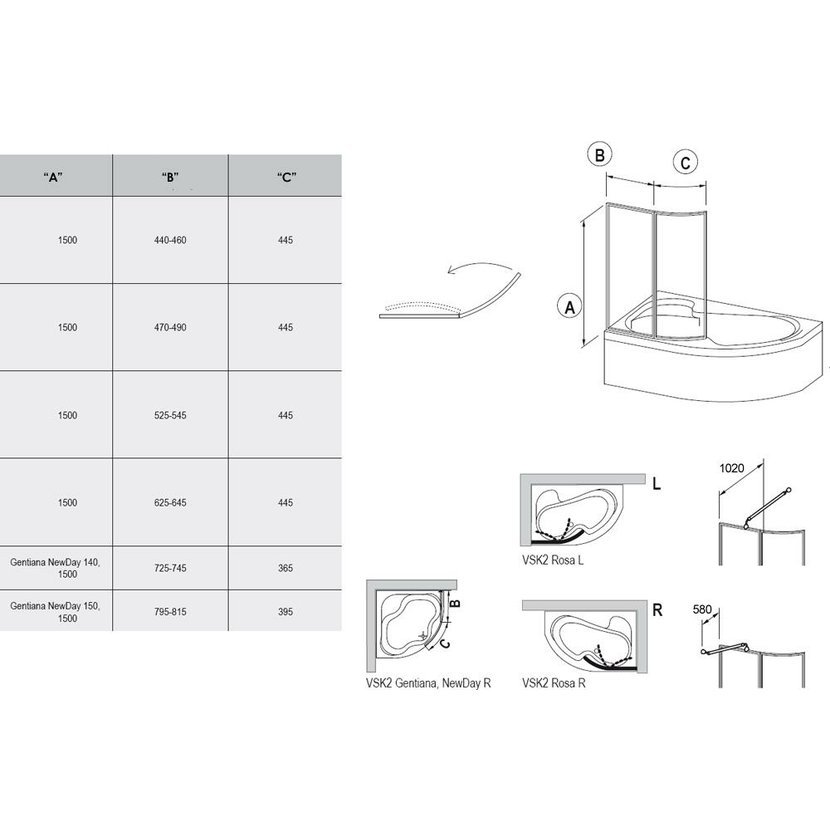 Vanovou zástěnu lze instalovat na Rosa I shodného rozměru a varianty (L/P) - (např. VSK2 Rosa 140 L k vaně Rosa I 140 L). Zástěna se skládá z pevné a pohyblivé části, kterou lze složit do vnitřního prostoru nad vanu. Konstrukce je vyrobena ze silnostěnných hliníkových profilů s kvalitní povrchovou úpravou a maximální těsností. Standardní výška zástěny je 1500 mm. Vanovou zástěnu VSK2 Rosa doporučujeme pro lepší fixaci upevnit pomocí držáku VSK2 krátkého nebo dlouhého, který je nutno dokoupit - není součástí balení.
