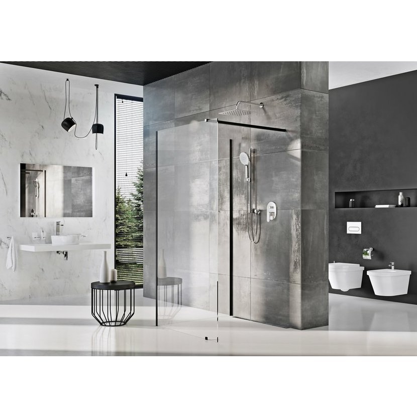 Sprchový kout Walk-In Corner s černou povrchovou úpravou kovových částí. Doporučujeme instalovat přímo na podlahu se zabudovaným odtokovým žlabem nebo podlahovou vpustí. Sprchový kout je univerzální, při montáži si zvolíte pravou či levou orientaci vstupu. První balení obsahuje dvě pevné skleněné stěny s ustavovacím profilem a rohovým spojovacím profilem v černém provedení.