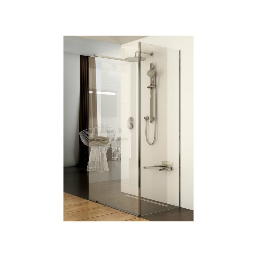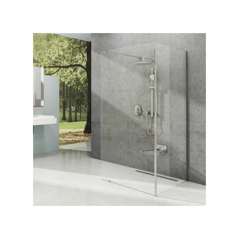Skla rohového sprchového koutu Walk-In Corner s otevřeným vstupem z jedné strany. Výplň z čirého skla s ochrannou vrstvou RAVAK AntiCalc®. Ustavovací profil v provedení lesklý chrom. Kompletní sprchový kout se skládá ze skel a kovových částí W SETU, který je nutné přikoupit.
