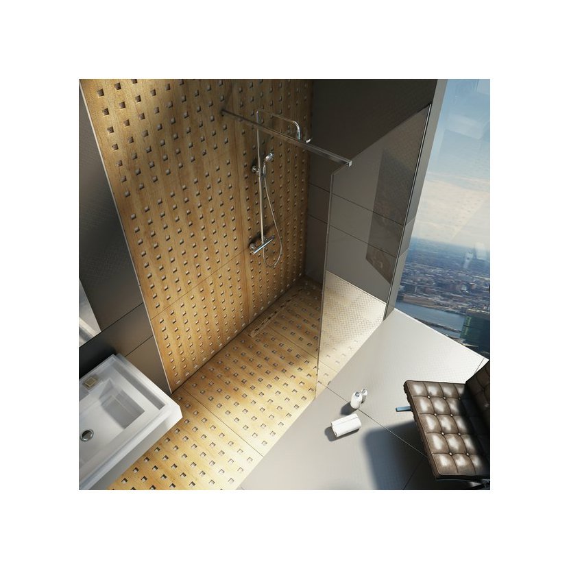 Sprchový kout Walk-In Wall tvoří tvrzené bezpečnostní sklo o tloušťce 8 mm. Stabilitu výrobku zajišťuje kovová vzpěra, která určuje šířku otevřeného vstupu.