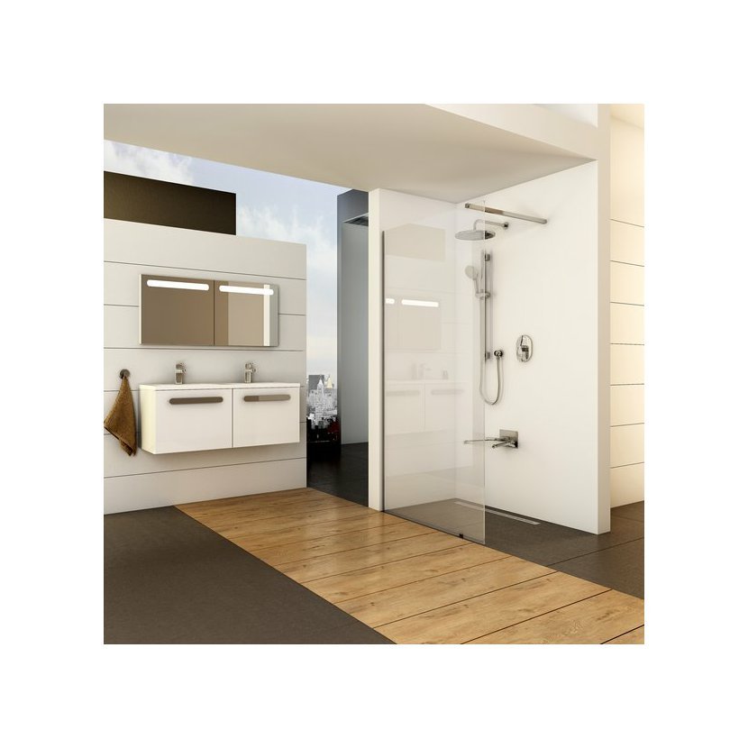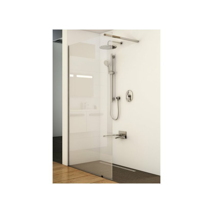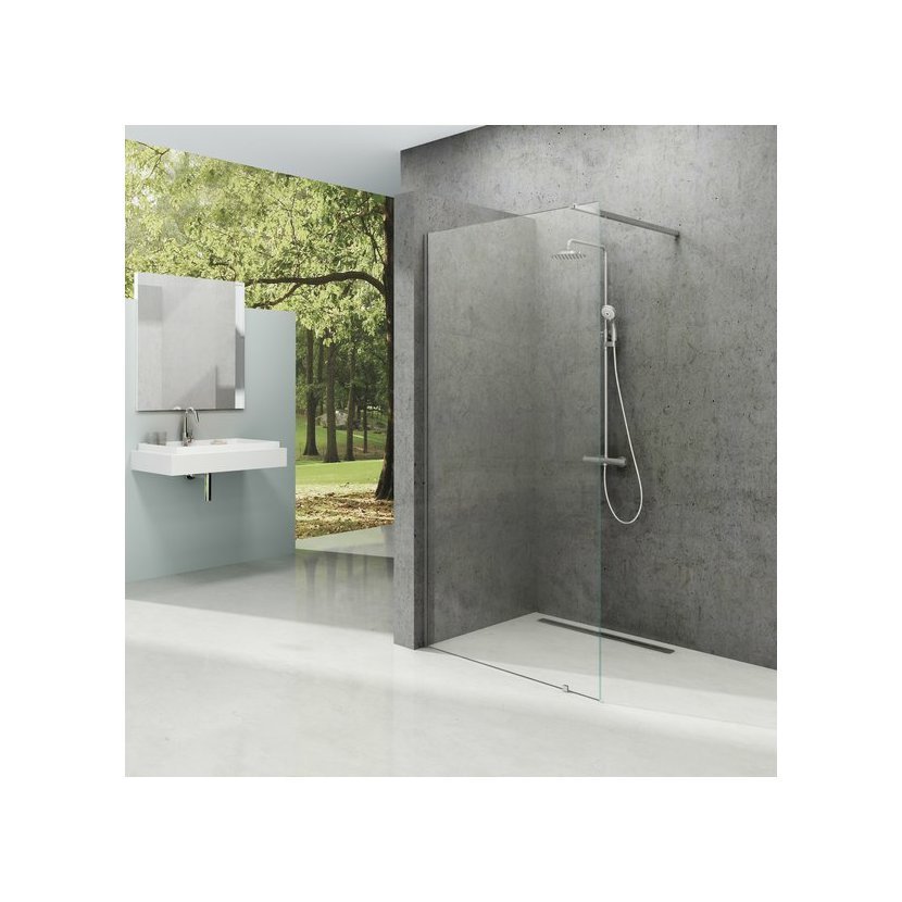 Sprchový kout Walk-In Wall tvoří tvrzené bezpečnostní sklo o tloušťce 8 mm. Stabilitu výrobku zajišťuje kovová vzpěra, která určuje šířku otevřeného vstupu.