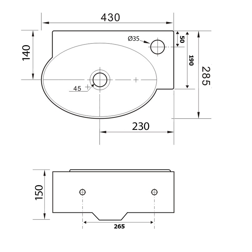 Parametry produktu RIBERA keramické umývátko rohové 43x28,5cm, otvor pro baterii vpravo, bílá