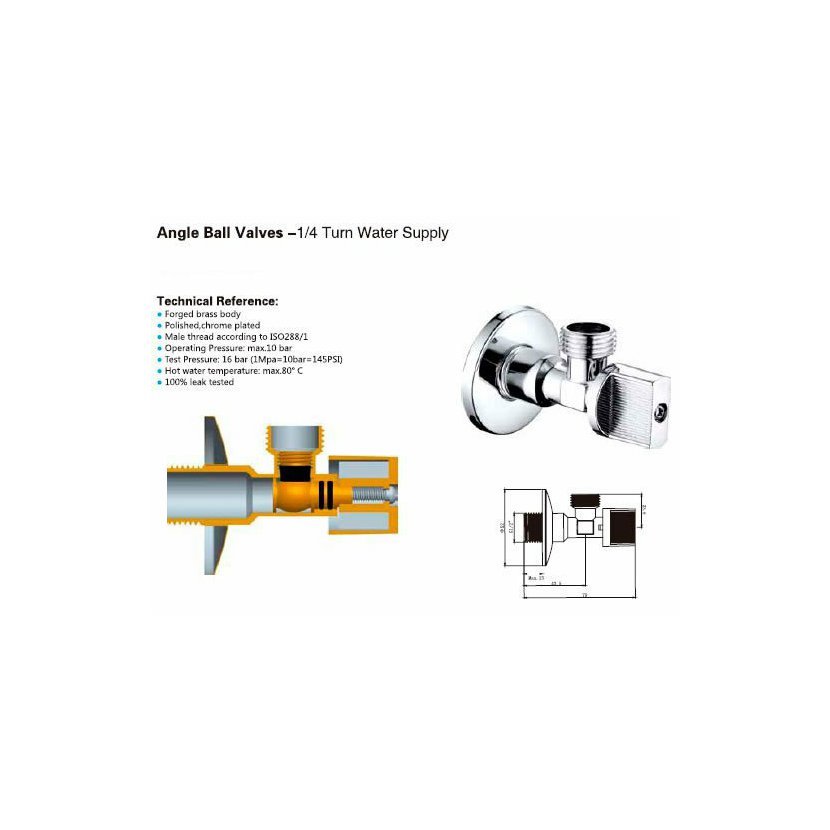 Kulový roháček pro připojení např. stojánkové baterie nebo WC nádržky Materiál: mosazný výkovek Povrch: leštěno a pochromováno Venkovní závity dle ISO288/1 Provozní tlak: 10bar Testovací tlak: 16bar Maximální teplota vody 80st. Celsia Těsn