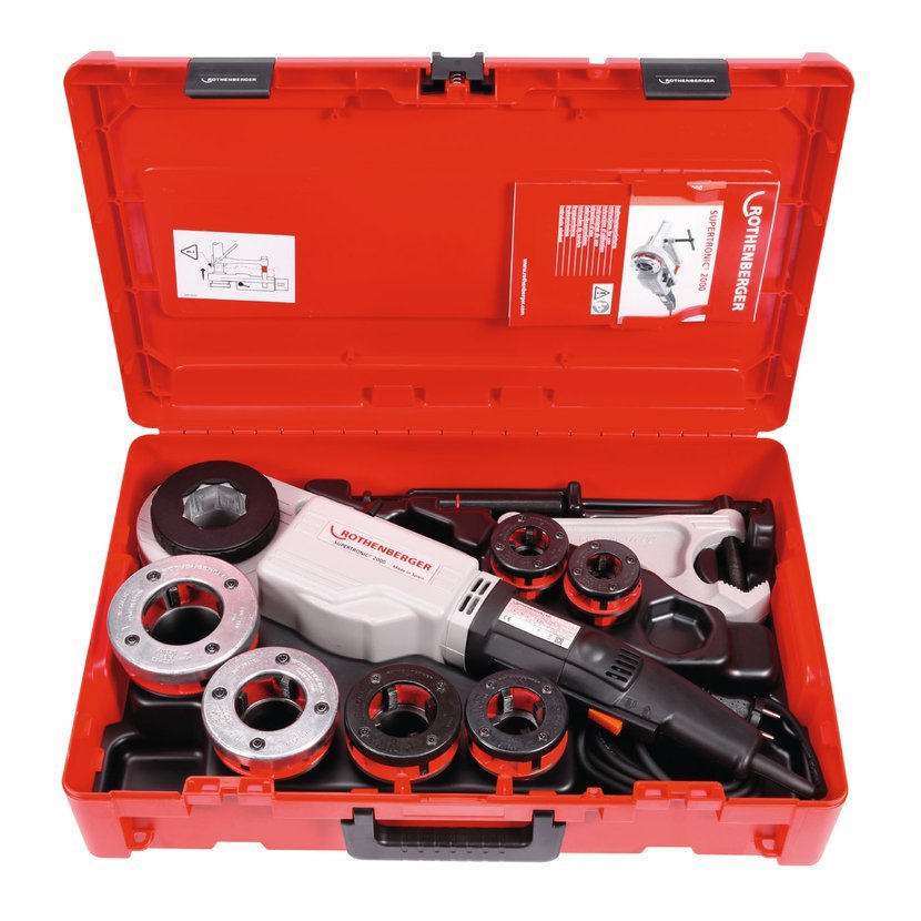 Sada pro elektrické řezání závitů. Obsahuje: ruční elektrický závitořez 1/4-2" (1010 W), svěrák na trubky (71280), ROFIX adaptér 1/4-5/4" (71271), závitořezné hlavy BSPT R 1/2-3/4-1-5/4-6/4-2", kufr ROCASE 6414 (1300003336).