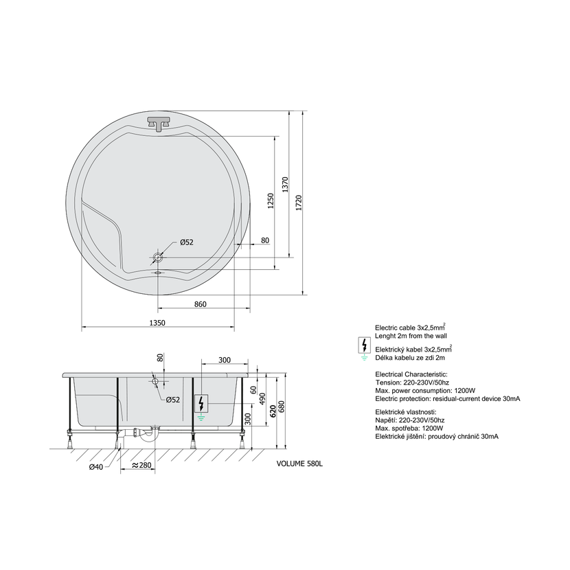 Parametry produktu ROYAL ROUND hydromasážní vana, 172x172x49cm, Active Hydro-Air, chrom