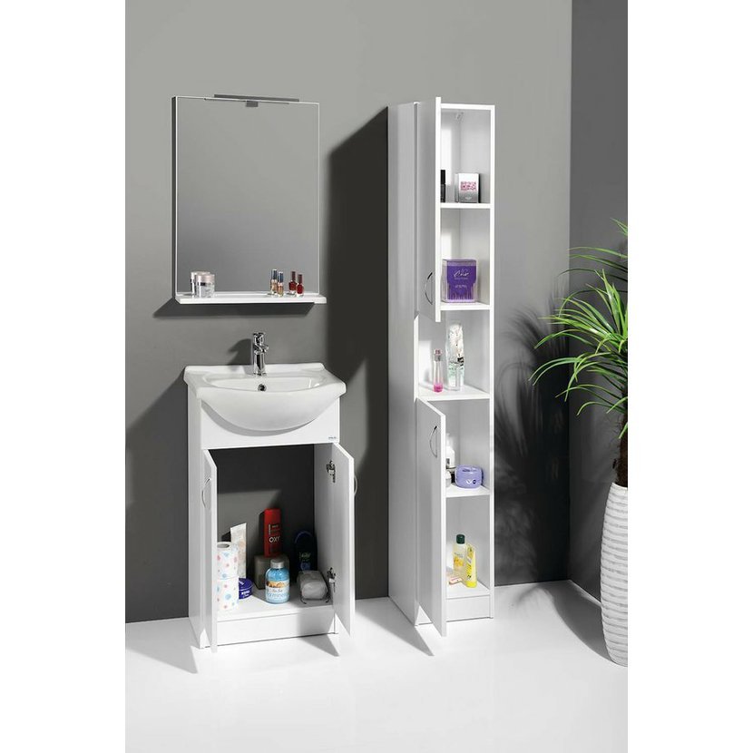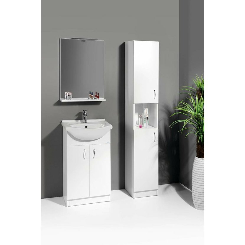Koupelnový nábytek z bílého lamina, nejjednodušší řešení pro Vaši koupelnu. Nabídka umyvadlových skříněk ve 4 rozměrech v šířkách od 50 cm do 65 cm v kombinaci s několika variantami doplňkových skříněk nabízí příznivé uspořádání nábytku téměř do každé koupelny za nejlepší cenu.