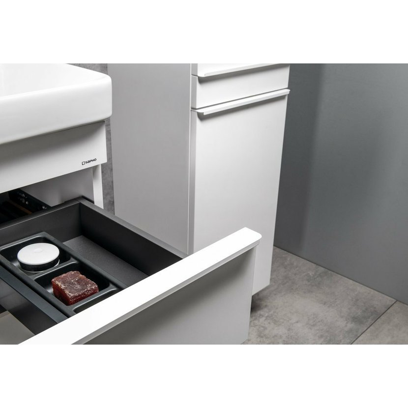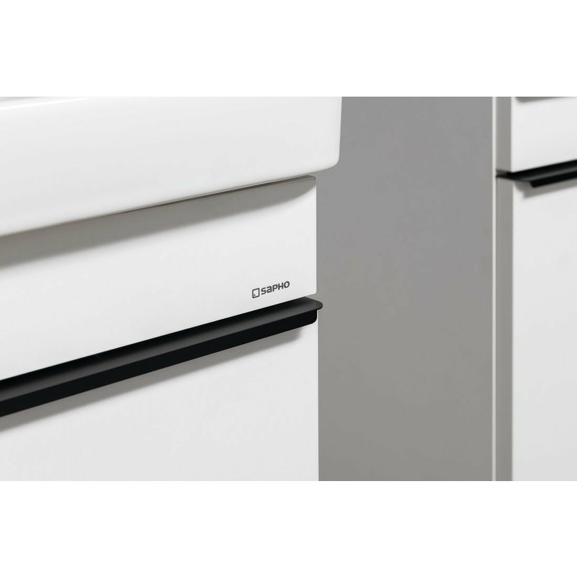 Série SITIA nabízí moderní vzhled díky tenké úchytce v matné bílé nebo černé barvě, umístěné po celé délce hrany zásuvek či dvířek. Použitím keramických umyvadel THALIE vytvoříme nadčasový koupelnový nábytek. Zásuvky jsou vybaveny výsuvy s pomalým dojezdem a automatickým dovřením, dvířka mají kování s tlumeným dovíráním. Horní i spodní zásuvky lze doplnit organizérem nebo miskami LINDO pro uložení předmětů každodenní potřeby. Série dále nabízí 2 rozměry doplňkových skříněk ve stejném designu.