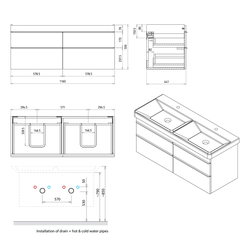 Parametry produktu SITIA dvojumyvadlová skříňka 116x50x44,2cm, 4xzásuvka, dub alabama