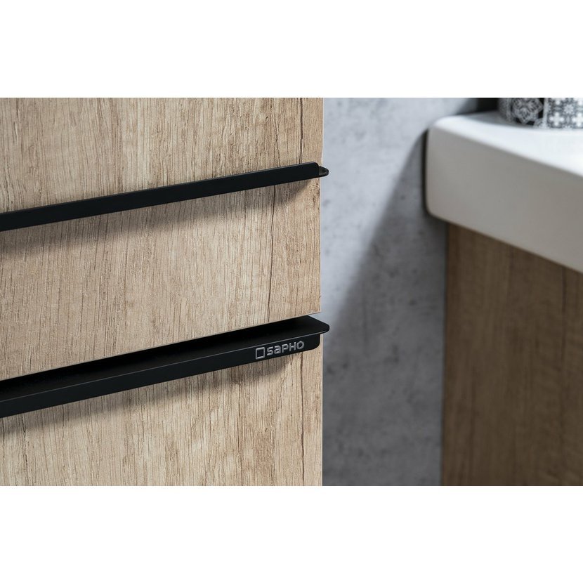 Série SITIA nabízí moderní vzhled díky tenké úchytce v matné bílé nebo černé barvě, umístěné po celé délce hrany zásuvek či dvířek. Použitím keramických umyvadel THALIE vytvoříme nadčasový koupelnový nábytek. Zásuvky jsou vybaveny výsuvy s pomalým dojezdem a automatickým dovřením, dvířka mají kování s tlumeným dovíráním. Horní i spodní zásuvky lze doplnit organizérem nebo miskami LINDO pro uložení předmětů každodenní potřeby. Série dále nabízí 2 rozměry doplňkových skříněk ve stejném designu.