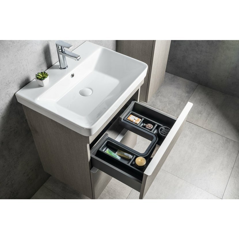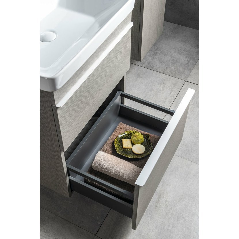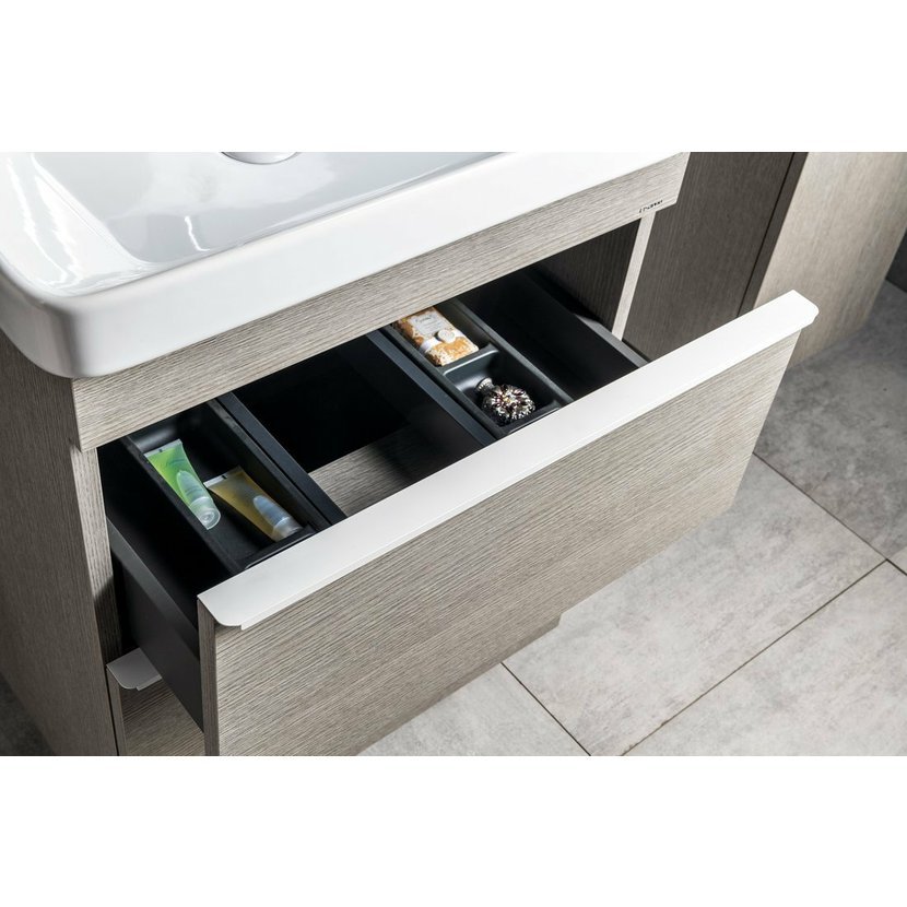 Série SITIA nabízí moderní vzhled díky tenké úchytce v matné bílé nebo černé barvě, umístěné po celé délce hrany zásuvek či dvířek. Použitím keramických umyvadel THALIE vytvoříme nadčasový koupelnový nábytek. Zásuvky jsou vybaveny výsuvy s pomalým dojezdem a automatickým dovřením, dvířka mají kování s tlumeným dovíráním. Horní i spodní zásuvky lze doplnit organizérem nebo miskami LINDO pro uložení předmětů každodenní potřeby. Série dále nabízí 2 rozměry doplňkových skříněk ve stejném designu.