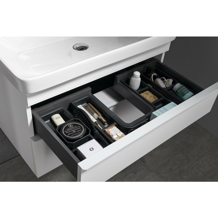 Série SITIA nabízí moderní vzhled díky tenké úchytce v matné bílé nebo černé barvě, umístěné po celé délce hrany zásuvek či dvířek. Použitím keramických umyvadel THALIE vytvoříme nadčasový koupelnový nábytek. Zásuvky jsou vybaveny výsuvy s pomalým dojezdem a automatickým dovřením, dvířka mají kování s tlumeným dovíráním. Horní i spodní zásuvky lze doplnit organizérem nebo miskami LINDO pro uložení předmětů každodenní potřeby. Série dále nabízí 2 rozměry doplňkových skříněk ve stejném designu.