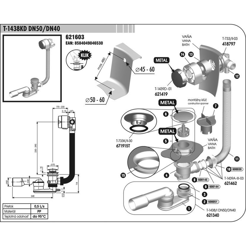 • sifon vanový s napouštěním přepadem • s výpustí clik-clak s košíkem na nečistoty • s flexibilní přepadovou trubkou • s otočnou rozetou • odpad 50/40mm • Vanové sifony click/clack jsou sifony s poloautomatickou zátkou. Prvním stisknutím zátky se výpust uzavře, druhým stiskem otevře. Pro čištění odtoků lze zátku snadno odšroubovat.