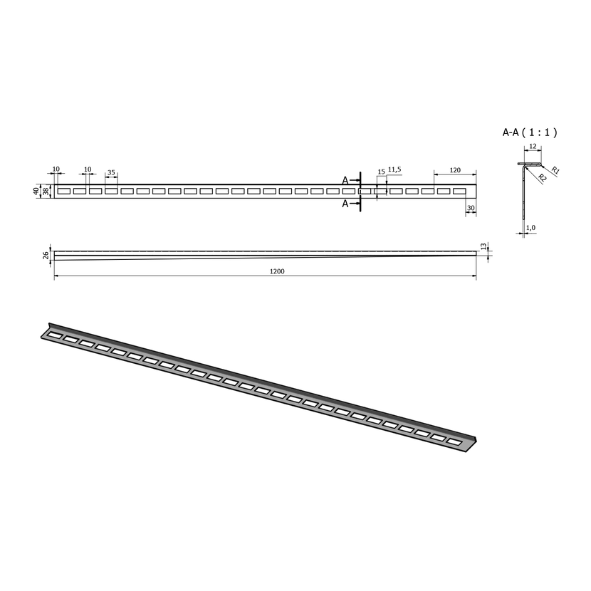 Spádová lišta, levá, výška 12mm, délka 1200mm, nerez mat