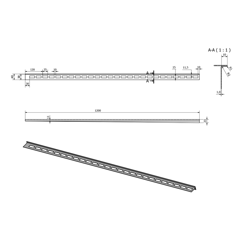 Parametry produktu  Spádová lišta, pravá, výška 10mm, délka 1200mm, nerez mat