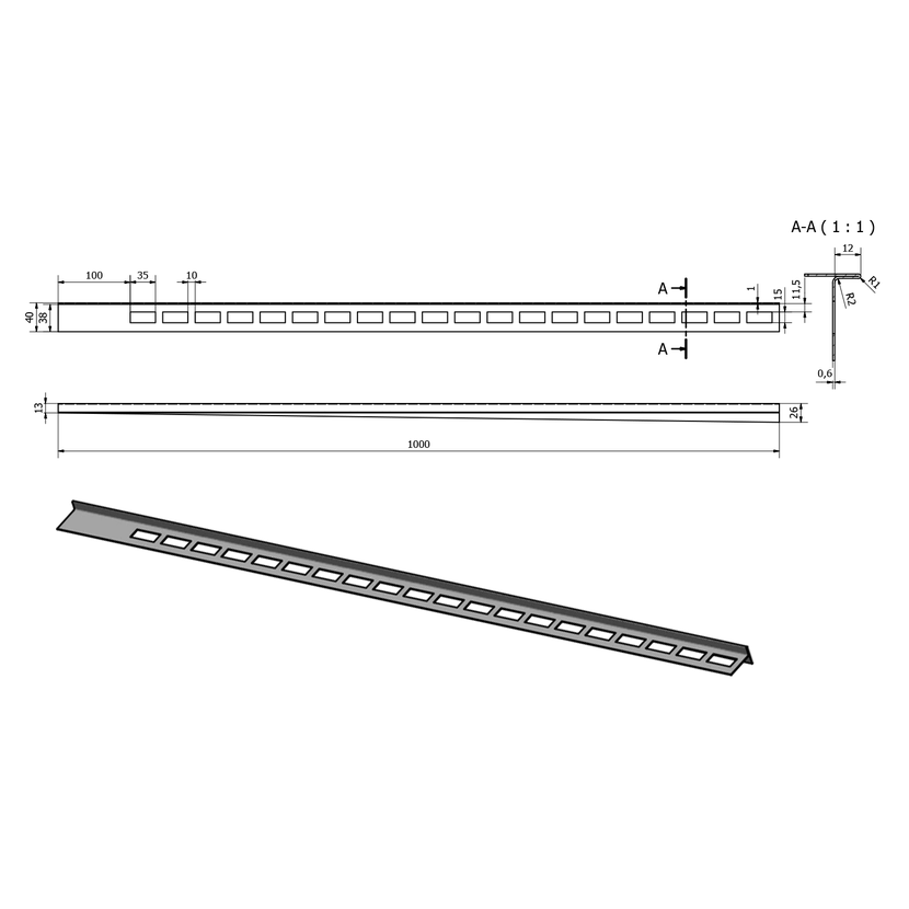 Spádová lišta, pravá, výška 12mm, délka 1000mm, nerez mat