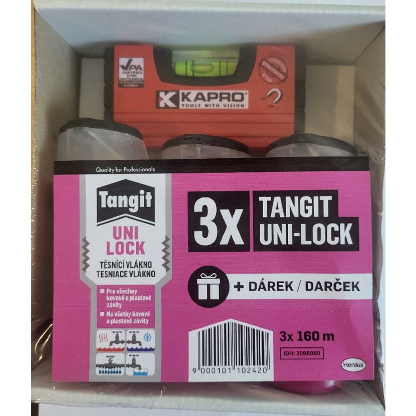 Tangit® Uni-Lock je závitové vlákno. Univerzální polyamidové vlákno je pokryto inertní ochrannou pastou. Ergonomické plastové obaly. Ihned po montáži poskytuje okamžité těsnění. Je vhodný k utěsnění kovových a plastových závitů podle ISO 7-1 až 4“ pro potrubí vody, plynu a stlačeného vzduchu, pro připojení odtokových kohoutků a větví potrubí pro instalaci stlačených vzduchových potrubí.
