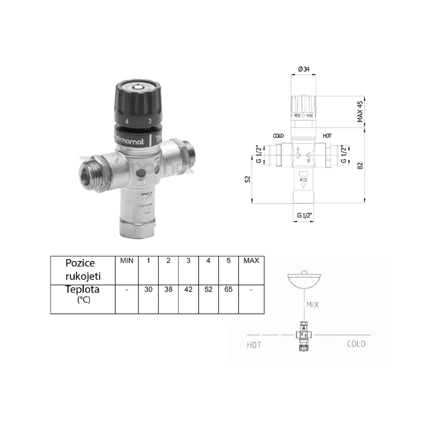 Parametry produktu  Termostatický regulátor teploty vody, 1/2", 30-60 stupňů, zpětné klapky