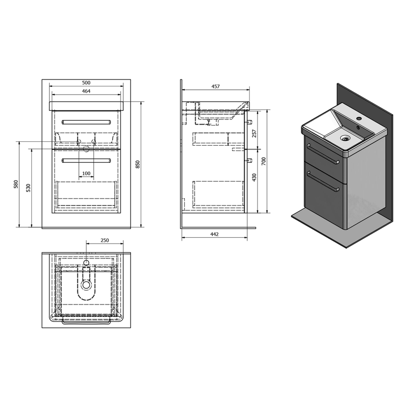 Parametry produktu THEIA umyvadlová skříňka 46,4x70x44,2cm, 2xzásuvka, bílá