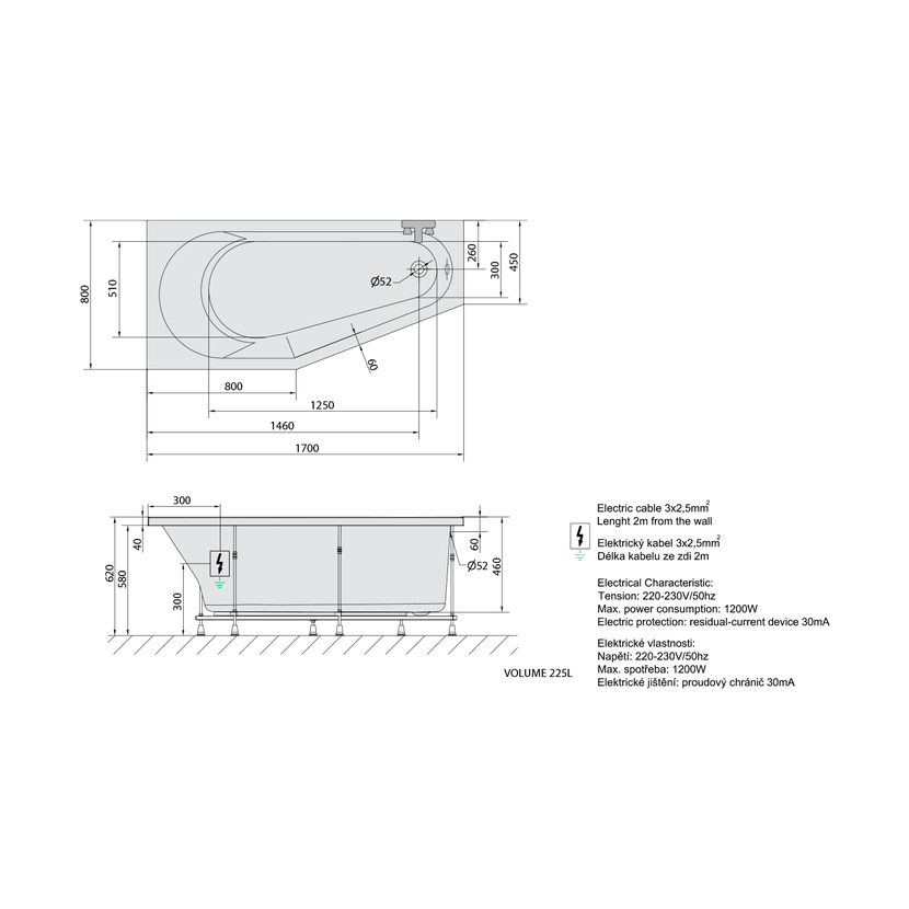 Parametry produktu TIGRA L hydromasážní vana, 170x80x46cm, Attraction Hydro-Air, chrom
