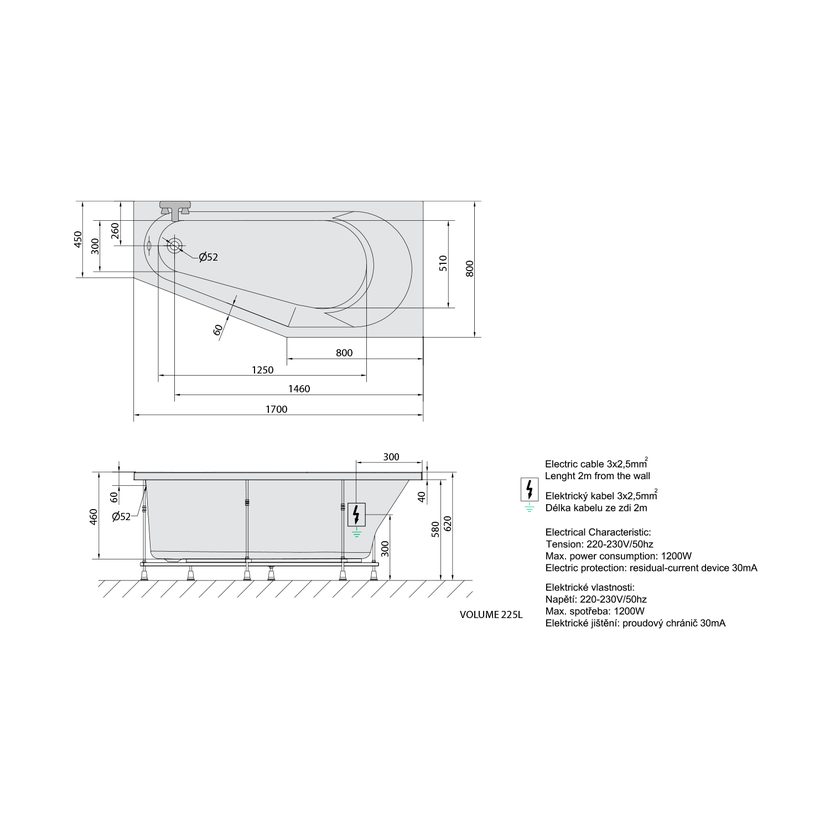 Parametry produktu TIGRA R hydromasážní vana, 170x80x46cm, Highline Hydro-Air, chrom