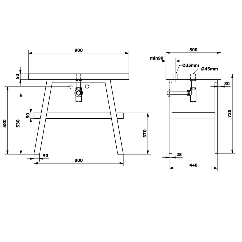 Stolek se skládá z ocelové podpěry TWIGA, horní desky AVICE o hloubce 50 cm a spodní desky (police) AVICE o hloubce 39 cm. Stolky o rozměrech 110 až 130 cm lze doplnit o zásuvku.