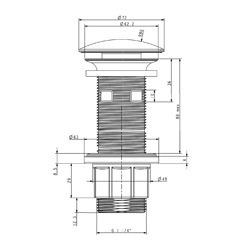 Parametry produktu  Umyvadlová výpust 5/4“, click-clack, velká zátka, 10-80mm, ABS/chrom