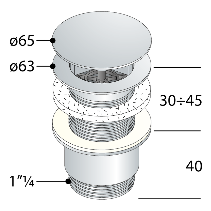 Parametry produktu  Umyvadlová výpust 5/4“, neuzavíratelná, velká zátka, 30-45mm, chrom