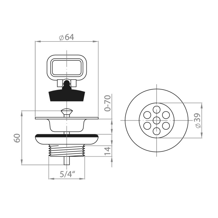 Umyvadlový výtokový ventil 5/4" x65, nerez, zátka s ouškem