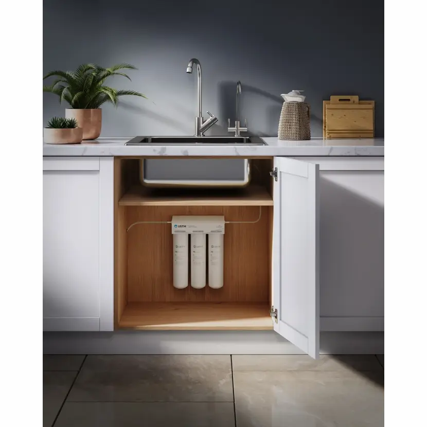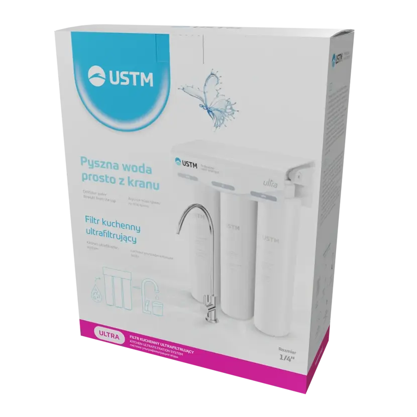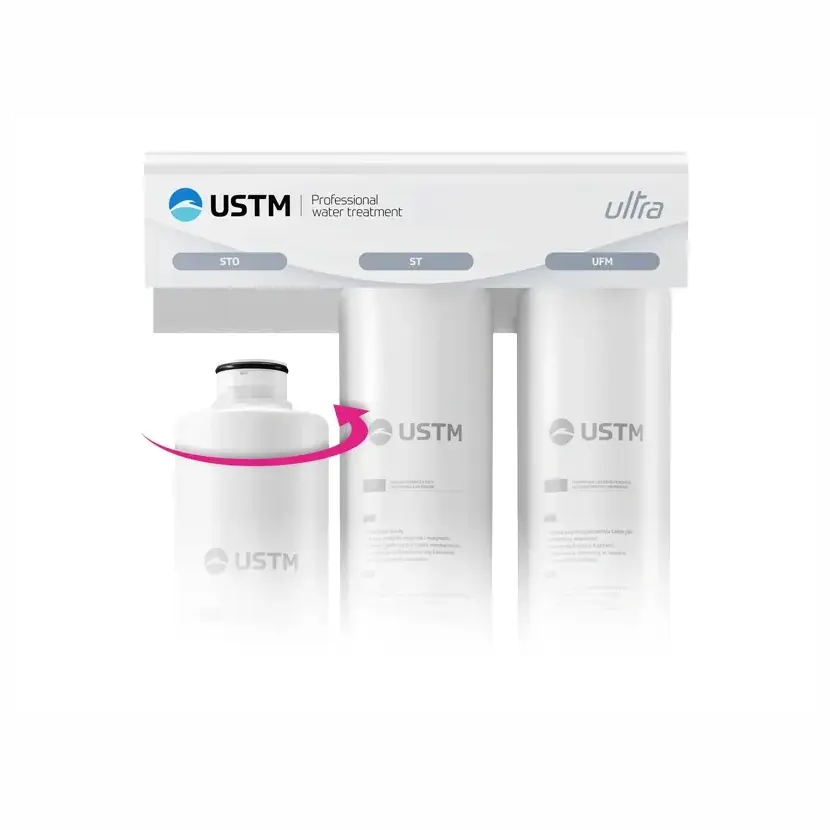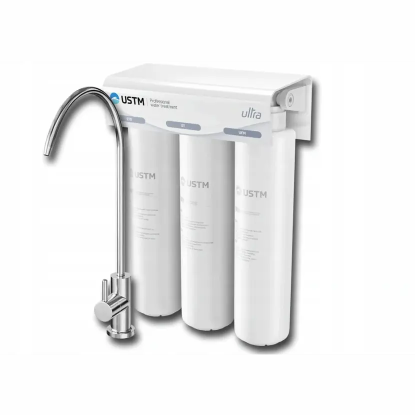 Kuchyňský třífázový filtr ULTRA řeší problematiku mikroplastů ve vodě pomocí UFM membrány s propustností 0,01mcr. Dále je osazen změkčující patronou ST a patronou STO, která řeší mechanické nečistoty a obsah aktivního uhlí vylepšuje chuť vody, redukuje chlór atd.