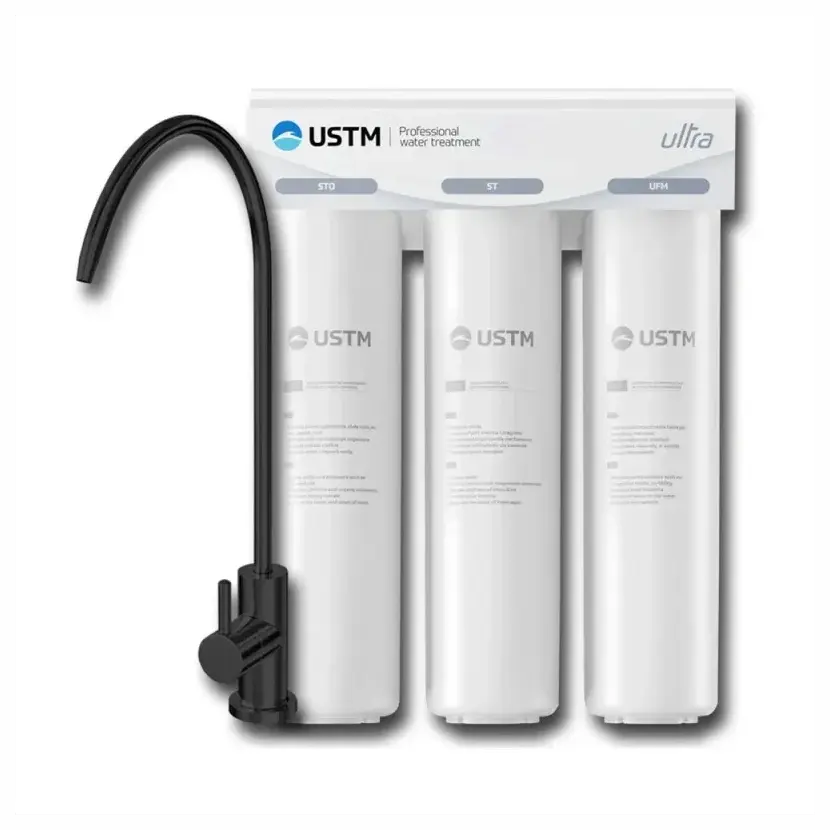 Kuchyňský třífázový filtr ULTRA řeší problematiku mikroplastů ve vodě pomocí UFM membrány s propustností 0,01mcr. Dále je osazen změkčující patronou ST a patronou STO, která řeší mechanické nečistoty a obsah aktivního uhlí vylepšuje chuť vody, redukuje chlór atd.