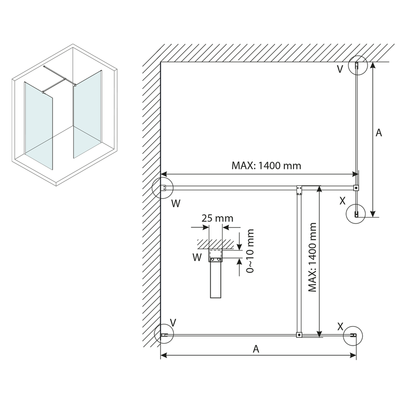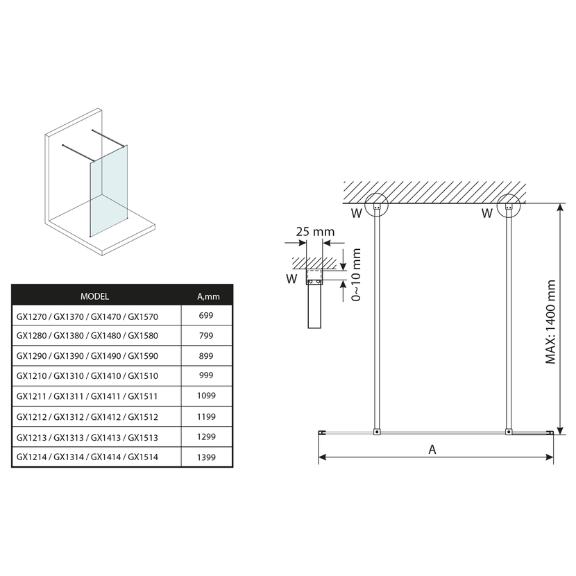 - Zástěny v šířkách 700 až 1400 mm