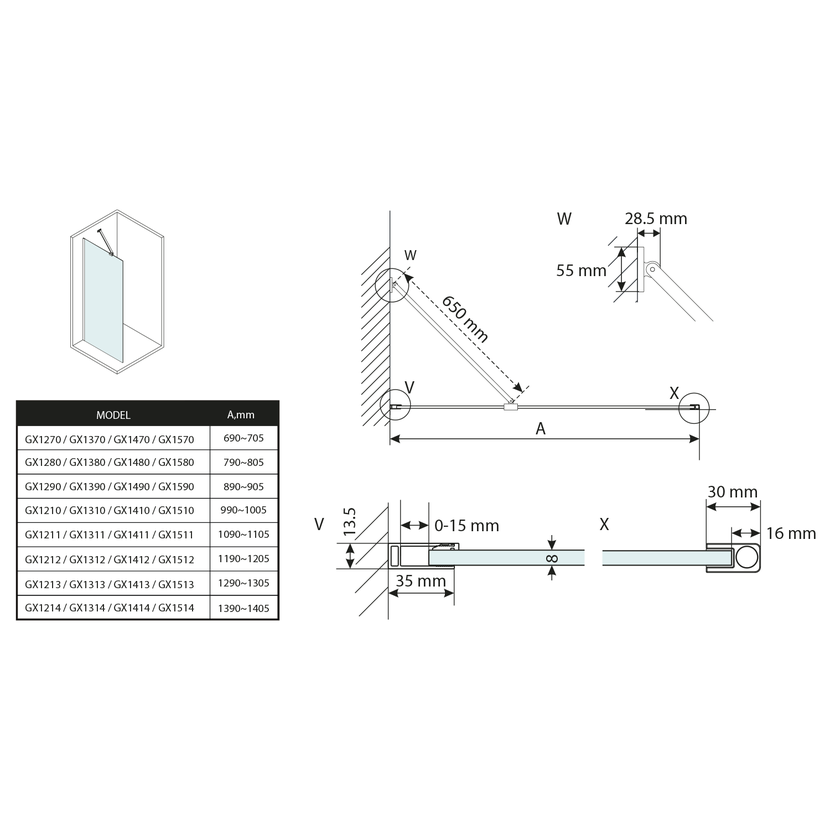 - Stěnové profily s tolerancí 15 mm usnadňují stabilní montáž zástěn, instalace je možná na dlažbu nebo sprchovou vaničku