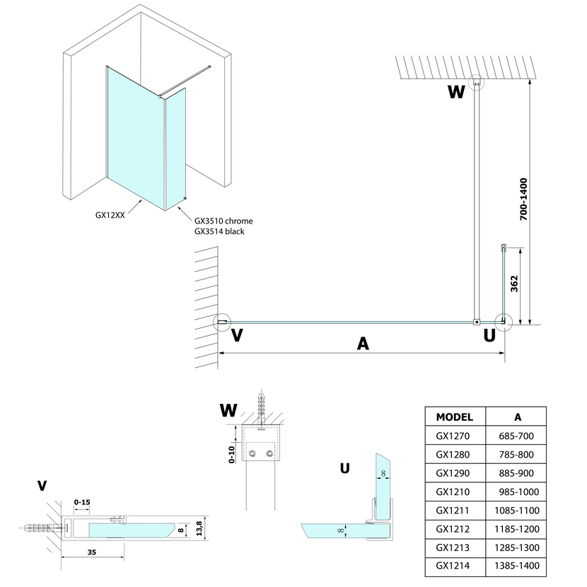 - Stěnové profily s tolerancí 15 mm usnadňují stabilní montáž zástěn, instalace je možná na dlažbu nebo sprchovou vaničku