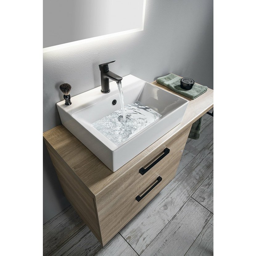 Koupelnový nábytek VEGA s deskou VEGA (HPL) v dekoru dub platin lze kombinovat s umyvadly na postavení.