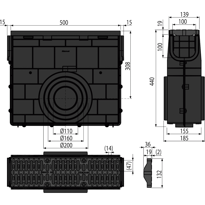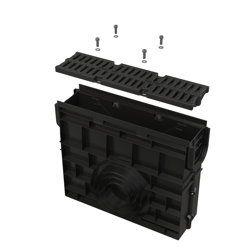 • Rošt plastový – fixovaný ve žlabu pomocí čtyř kusů nerezových šroubů, šířka vtokové štěrbiny 14 mm