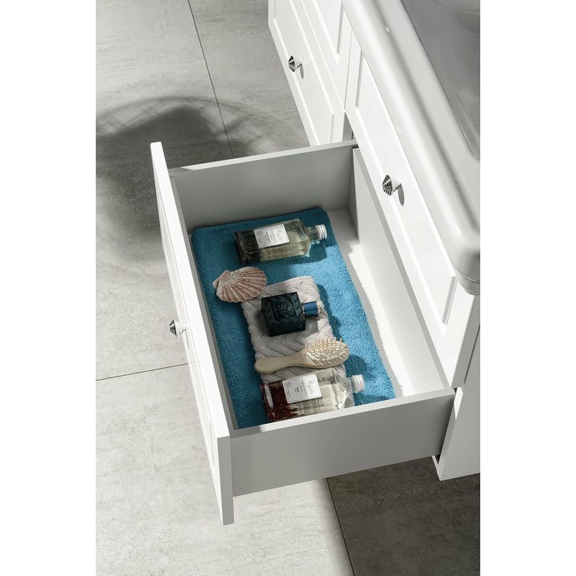 Skříňky VIOLETA ve vintage stylu s plastickým dekorem na zásuvkách i korpusu, doplněné úchytkou s krystalem SWAROVSKI, jsou vyráběny v bílém pololesklém provedení.