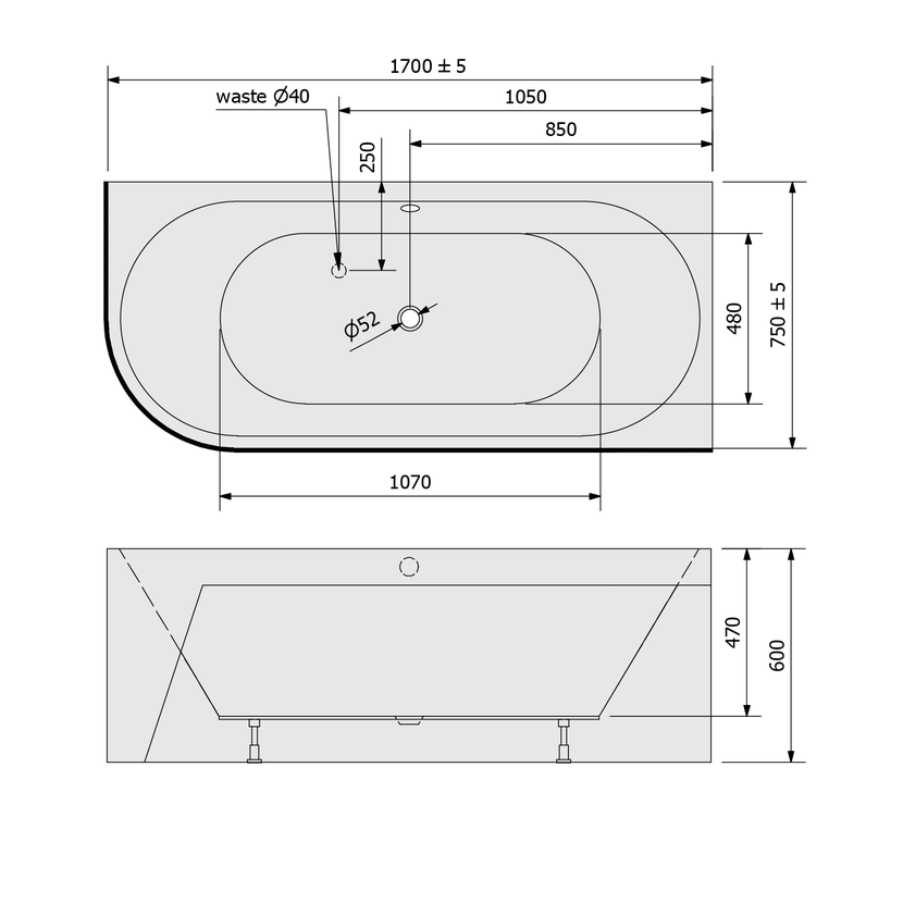 Parametry produktu VIVA R MONOLITH asymetrická vana 170x75x60cm, šedá